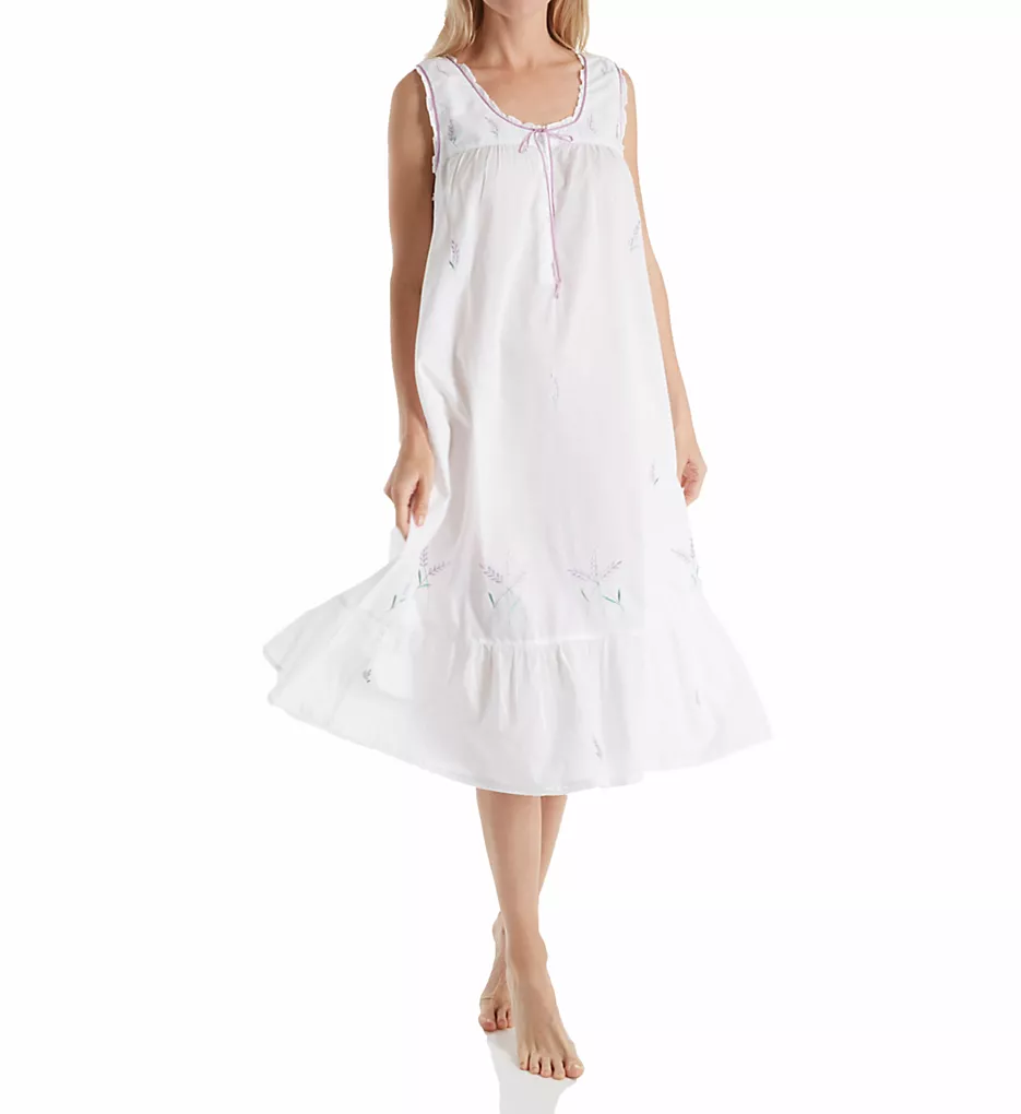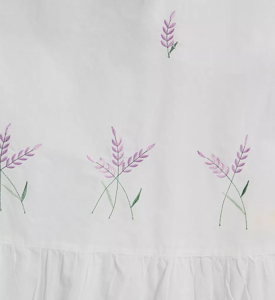 Light, soft, high quality cotton nightgown with classical styling and joyful lavender embroidery. Made of preshrunk, woven 100% cotton.