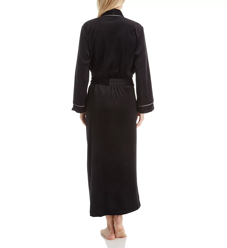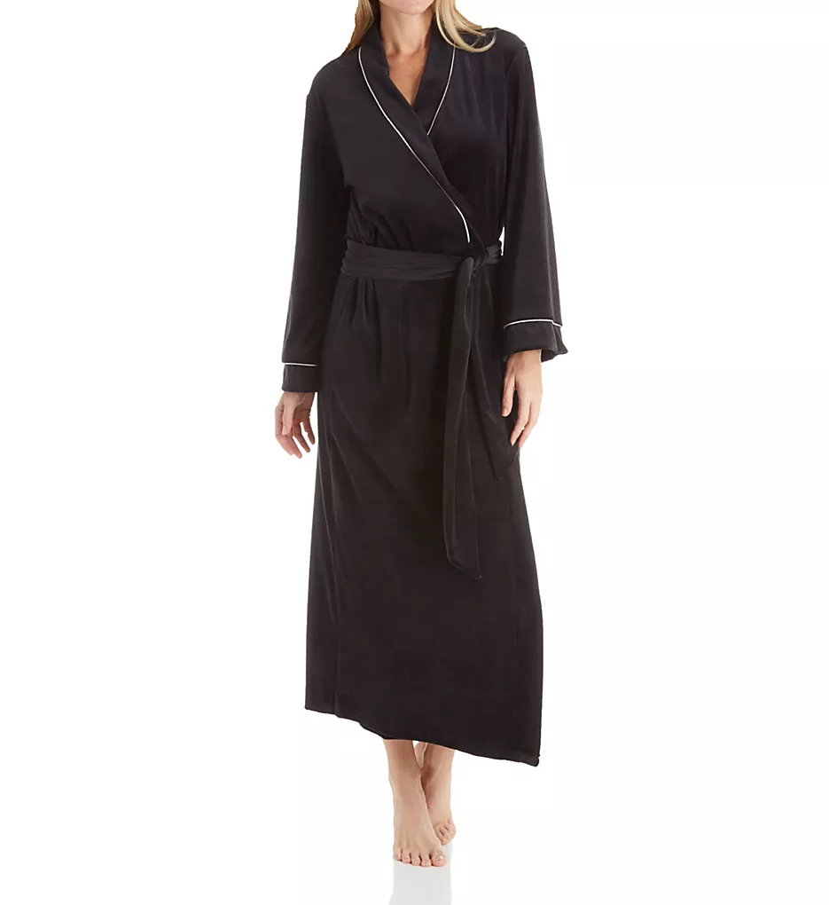 This floor-length robe features a classic lapel styled with sophisticated contrast piping along the edges and cuffs. The rich velour knit provides a subtle sheen, while the wide, sewn-on belt at the ruched back ensures a flattering, secure fit every time.