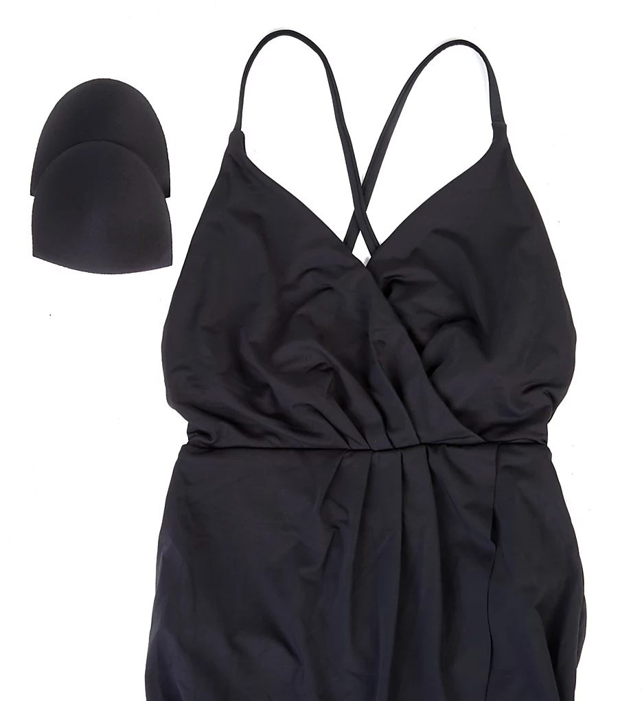 This one-piece features a sophisticated V-shape surplice neckline that overlaps at the center, complemented by delicate pleating for added texture. The elastic waist allows the skirt to flare out beautifully, while the razor-cut high-low hem offers extra coverage in the back without sacrificing style. Subtle goldtone metal hardware adds a touch of luxury to the adjustable straps.
