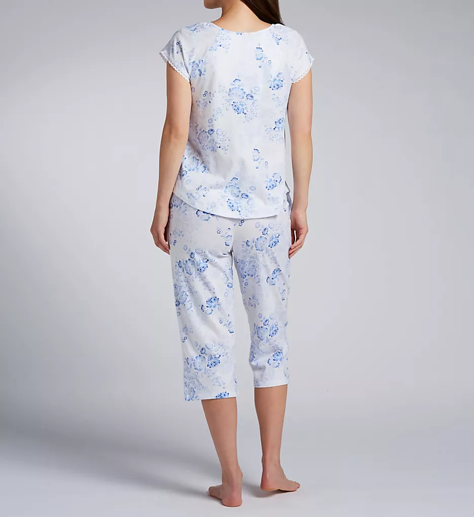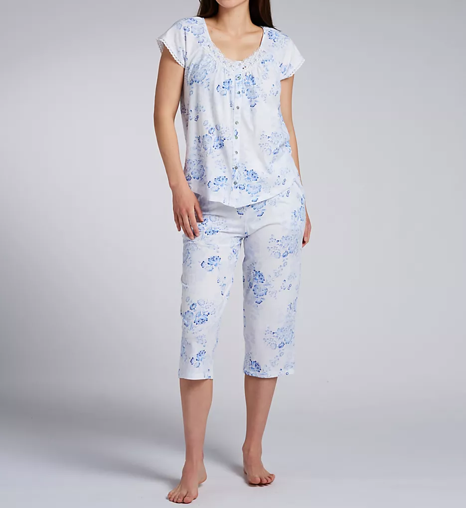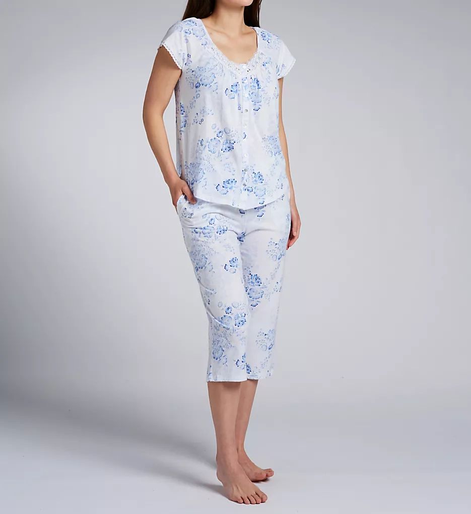 This matching set features a charming blue and white floral motif throughout. The top is detailed with elegant eyelet lace panels and a satin ribbon-laced V-neckline, secured by nine polished Akoya shell buttons for a touch of luxury. The capri-length bottoms provide a breezy, relaxed fit perfect for lounging or sleeping.