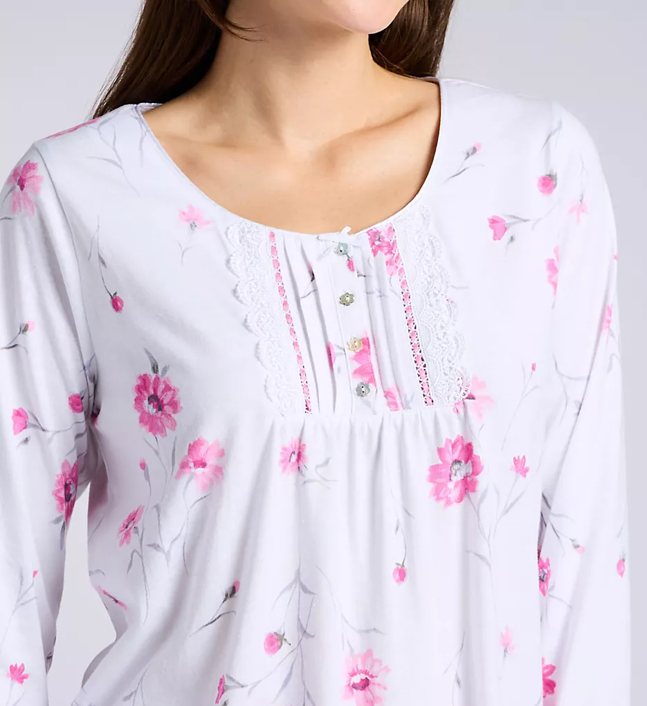 This pajama set features a delicate floral pattern accented by satin piping along the round neckline. The Henley placket is uniquely adorned with four flower-shaped button closures and framed by satin ribbon-threaded lace trim and pintucks. The top is finished with a graceful shirttail hem, while the full-cut pants provide a relaxed, airy silhouette.
