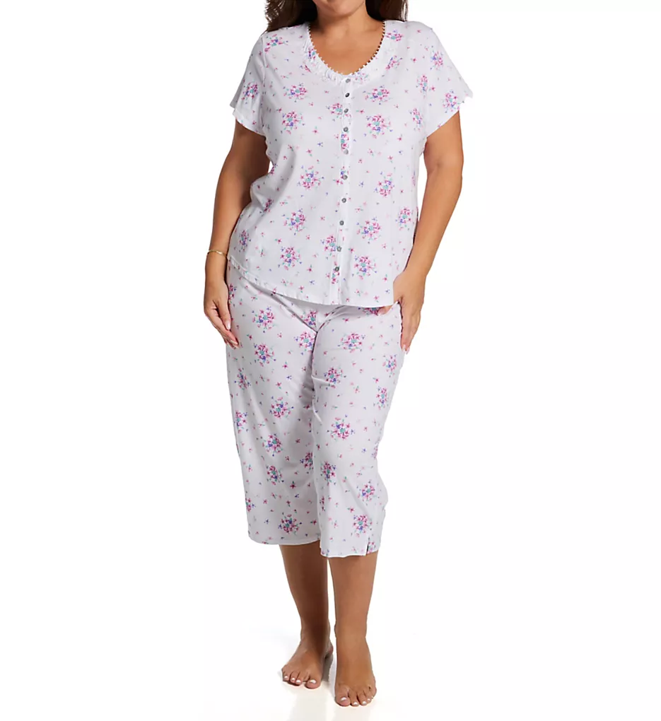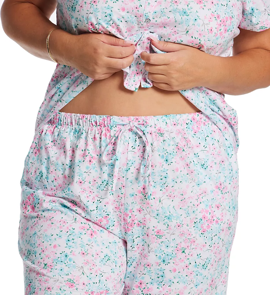 - Set includes button-up top and capri-length bottoms.
