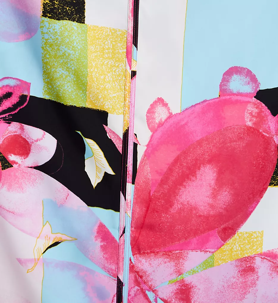 V-neck caftan has a contemporary large watercolor flower design on a mulit-print background. Made of woven polyester.