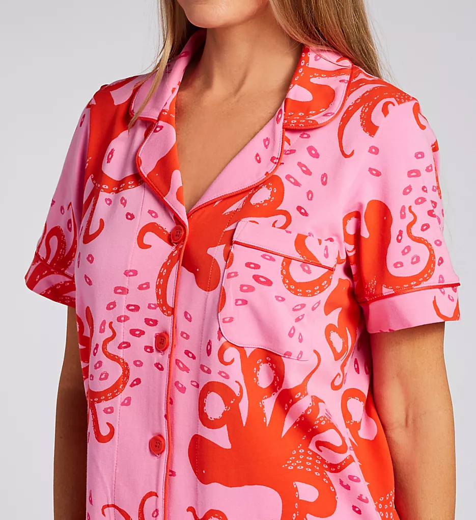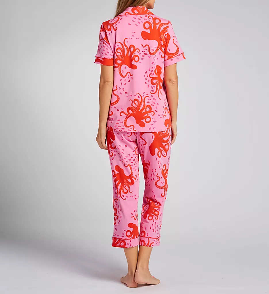 Experience the perfect blend of whimsy and luxury with the BedHead Pajamas Sea Dreams Cropped Classic PJ Set. This set features a charming nautical-inspired ‘Sea Dreams’ pattern set against soft organic cotton jersey, elevated by sophisticated red piping accents that bring a touch of classic tailoring to your loungewear.