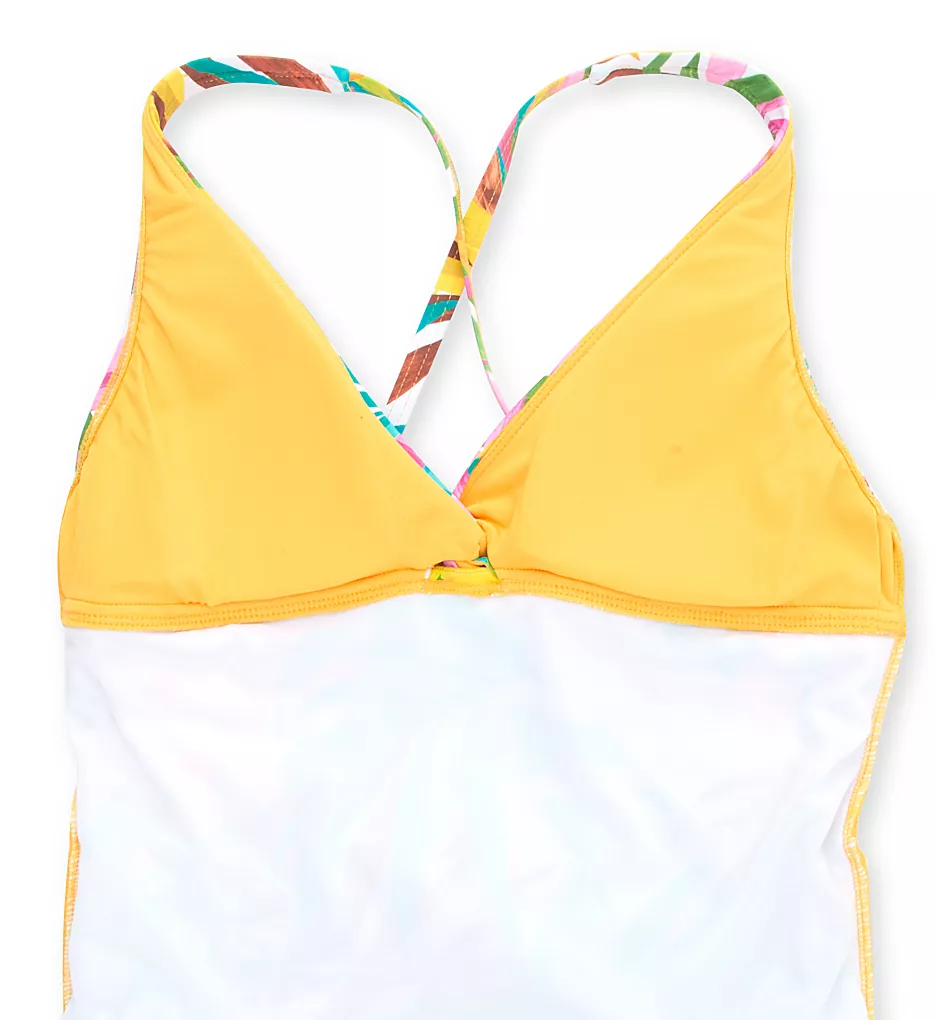 The Fantasy Island print features a lush array of oversized palm leaves in shades of hibiscus pink, emerald green, and soft cream set against a deep midnight background. The design is elevated by a chic center-twist detail at the bust that creates a subtle drape, while the adjustable X-back straps are accented with elegant goldtone metal hardware for a touch of glamour.