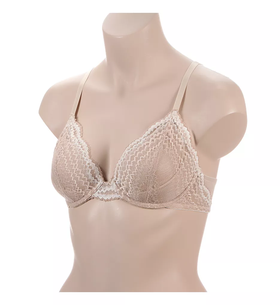 Sheer lace bra has padded side support sling in underwire cups and soft microfiber knit at back for added comfort. Plunge neckline shows off your cleavage and “disappears” under lower cut styles. Made of nylon, elastane, and polyester.