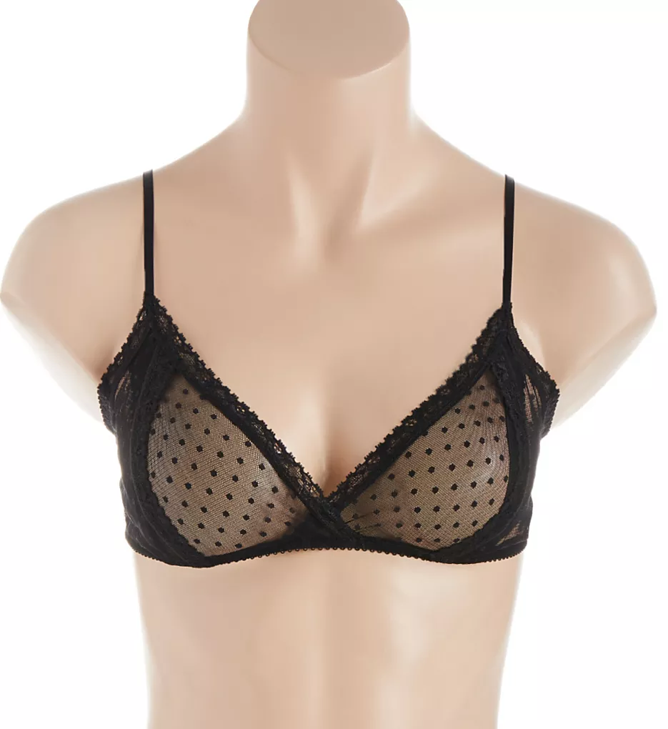 This sexy see-through polka-dot mesh bra features lace trim and peek-a-boo center front slits on cups. Made of 100% nylon.