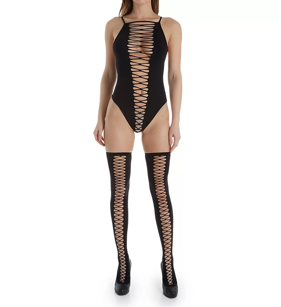 - Complete Lingerie Set: Includes one strappy teddy bodysuit and matching thigh-high hosiery.