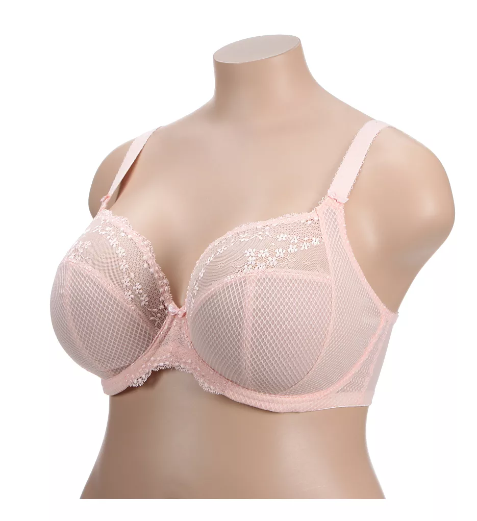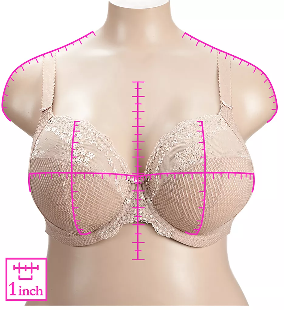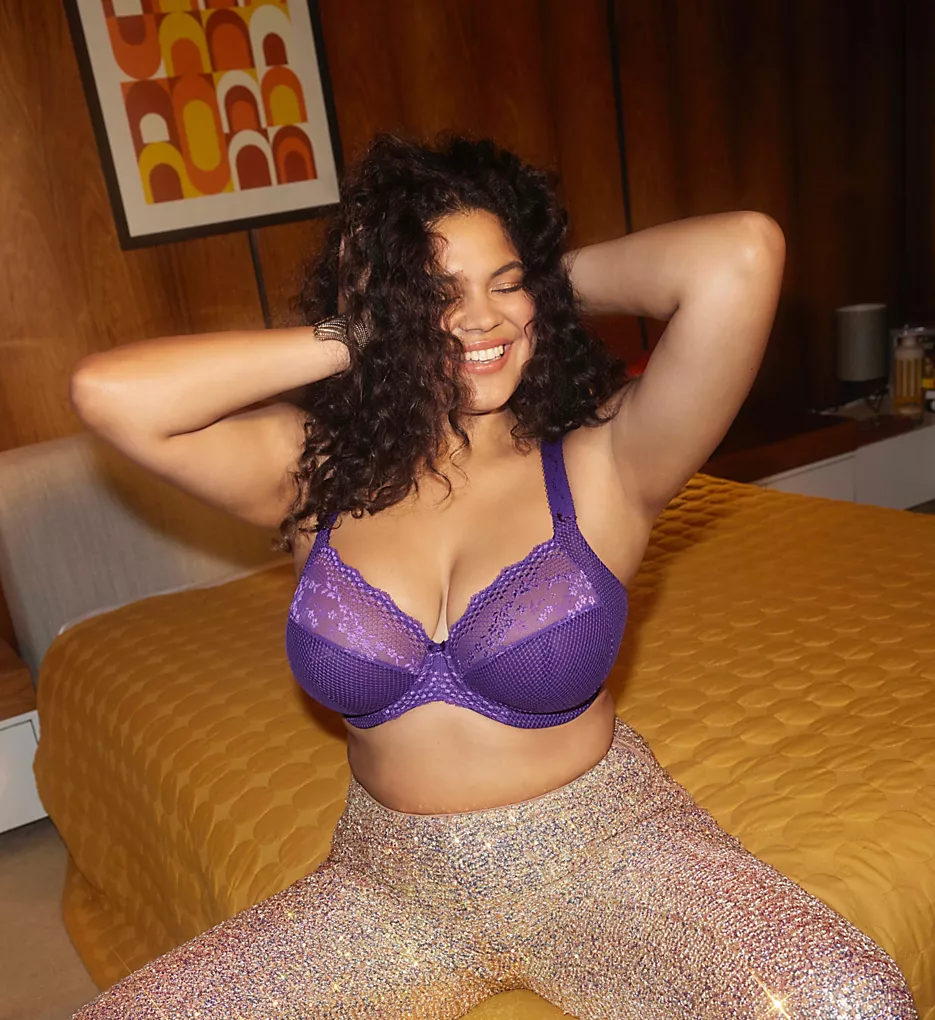 - Sheer, diamond-patterned mesh cups have angled and vertical seaming for shape and support.