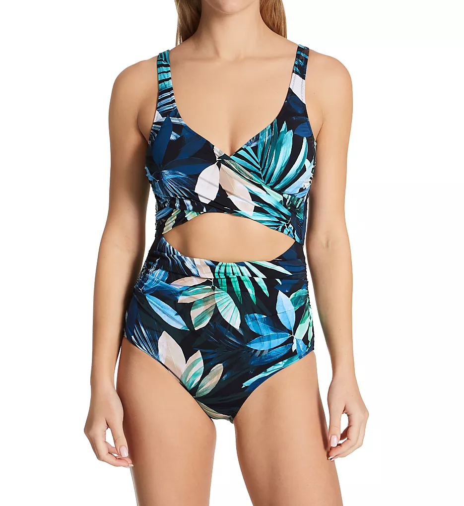 Crafted in a classic deep black colorway, this swimsuit showcases a stunning overlapping wraparound front that creates a secure, fixed V-shaped neckline. The design is elevated by strategic side cutouts at the mid-section and back, offering a trendy peep-hole look, while the ruching texture at the sides works to accentuate and flatter your natural waistline.