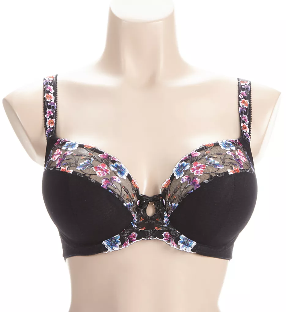 - Sheer upper cup and front straps are embellished with colorful, overprinted floral embroidery.