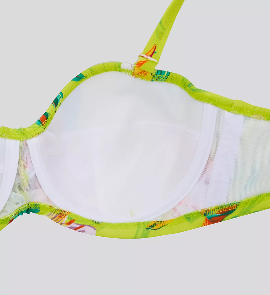 The Cala Macarella features a lush, multi-colored botanical print set against a bold background, evoking the spirit of a Mediterranean escape. The sweetheart neckline is accented by a chic twisted center overlay and a playful ‘bunny ear’ tie, while the seamed underwire cups provide a naturally rounded silhouette and no-show coverage.