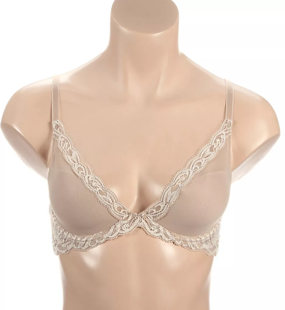This deep plunge bra features a beautiful scalloped lace trim along a stretch mesh overlay, helping to give you a truly pretty look. Seamless sides for a smooth look under clothes. Very comfortable, and light as a feather!