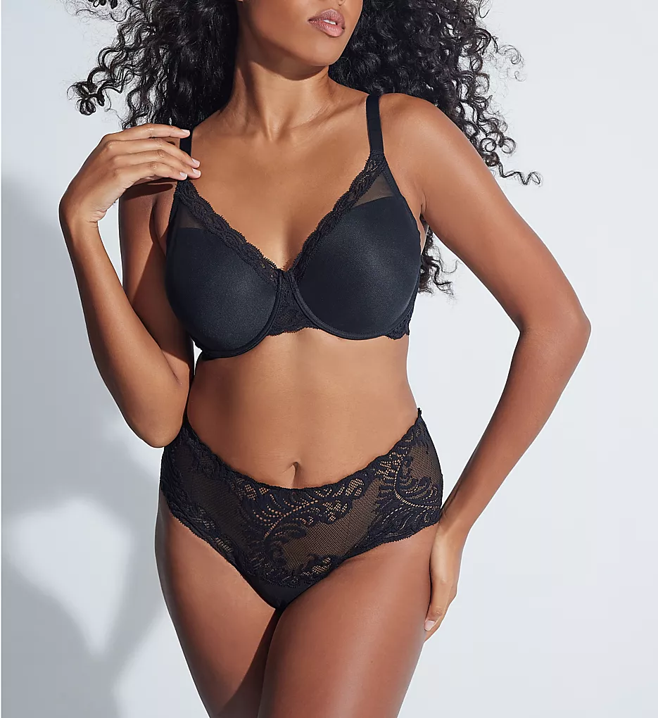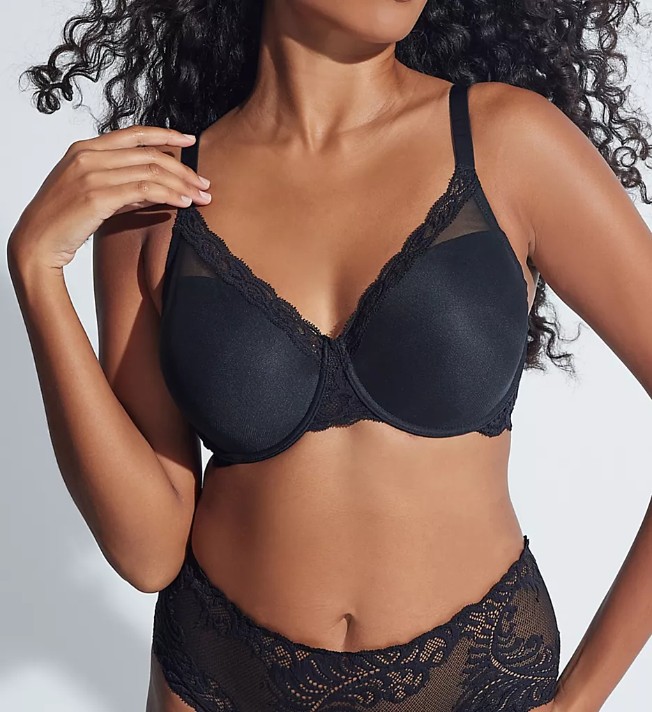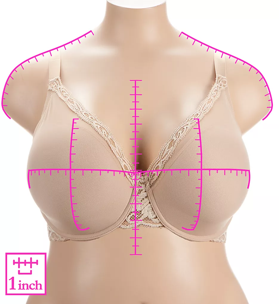 - Wide center front with stabilizing backing separates and contains breasts, with pretty lace overlay.