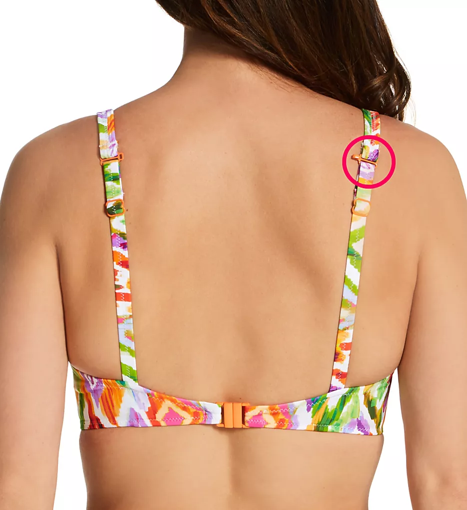 Dive into the vibrant energy of summer with the Freya Tusan Beach Underwire High Apex Bikini Top. Designed for both style and superior support, this top features a striking ikat pattern in a collage of sunset-inspired colors and geometric shapes on a soft microfiber exterior. The plunge neckline and bra-sized cups offer a flattering silhouette without sacrificing the security you need for a day at the beach.