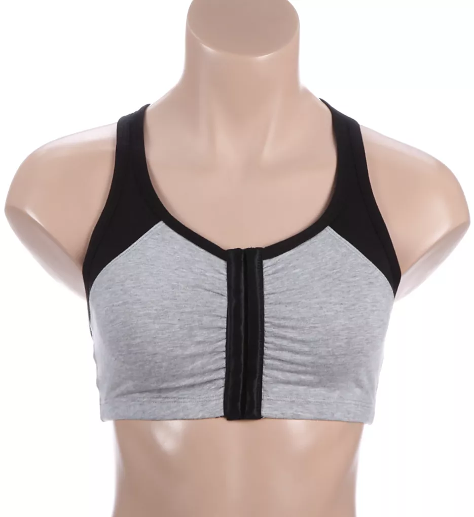 These fun sports bras will take you from yoga class to a spirited, low impact walk in comfort and style! Front closure has hook-and-eye closure. Cups are lined with moisture wicking tech knit. Made of cotton/spandex with polyester/spandex lining. Includes two in package.