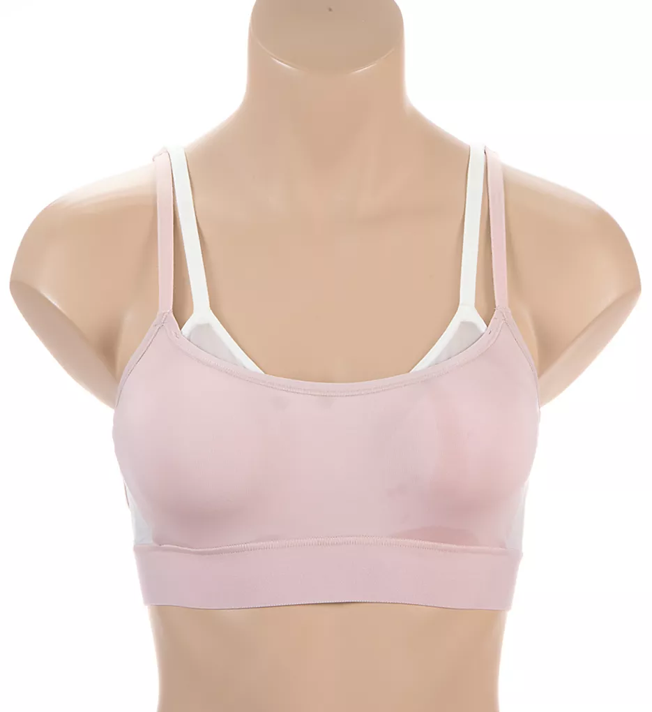 Polished sports bra has an elegant, sculptural look with a smartly constructed 2-layer body to ensure a higher degree of control, support and airflow. Peek-a-boo mesh windows. Made in Coolmax polyester and Lycra spandex.