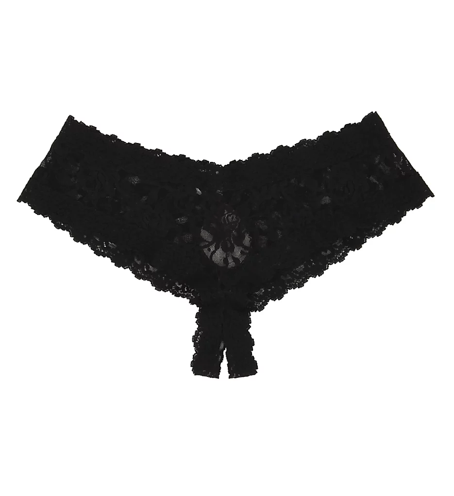 This crotchless panty has an alluring back keyhole and bow, and is open at the crotch for lacy, racy style. Made of nylon fabric.
