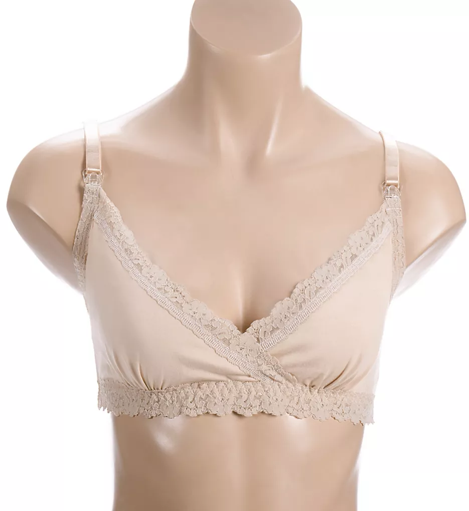 This soft, feminine wireless bra is trimmed with lace, and the convenient nursing clips on the strap bases make it easy for you to nurse your baby. Made of Supima cotton/nylon/spandex.