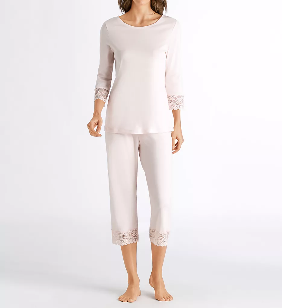 Visual Details: This elegant set features a scoop-neck top with refined 3/4-length sleeves, each adorned with a wide band of intricate lace. The coordinating cropped pants offer a relaxed, straight-leg silhouette, finished with a stunning 3-inch lace cuff at the hem that adds a touch of feminine sophistication to your loungewear collection.