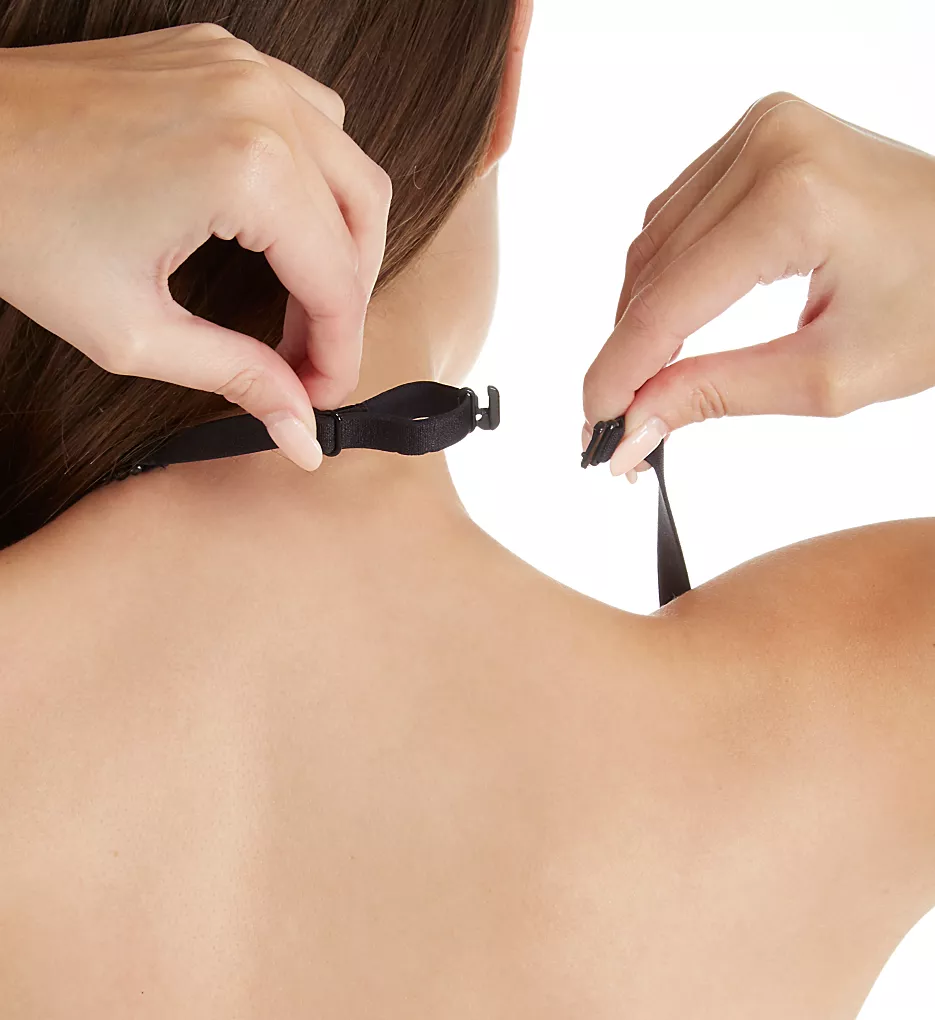 - Convertible elastic straps are 3/8″ wide and adjust in the back with coated metal hardware. Sides have three loops for strap positioning and plastic barrel closure for crossed back and Halter styling.