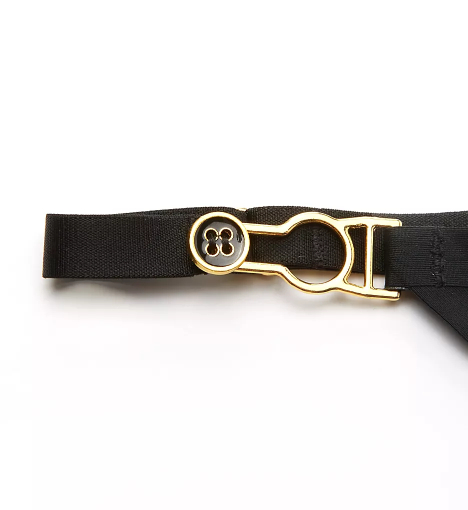 - Elastic waistband and sides are 3/8″ wide and adjust with goldtone metal hardware.