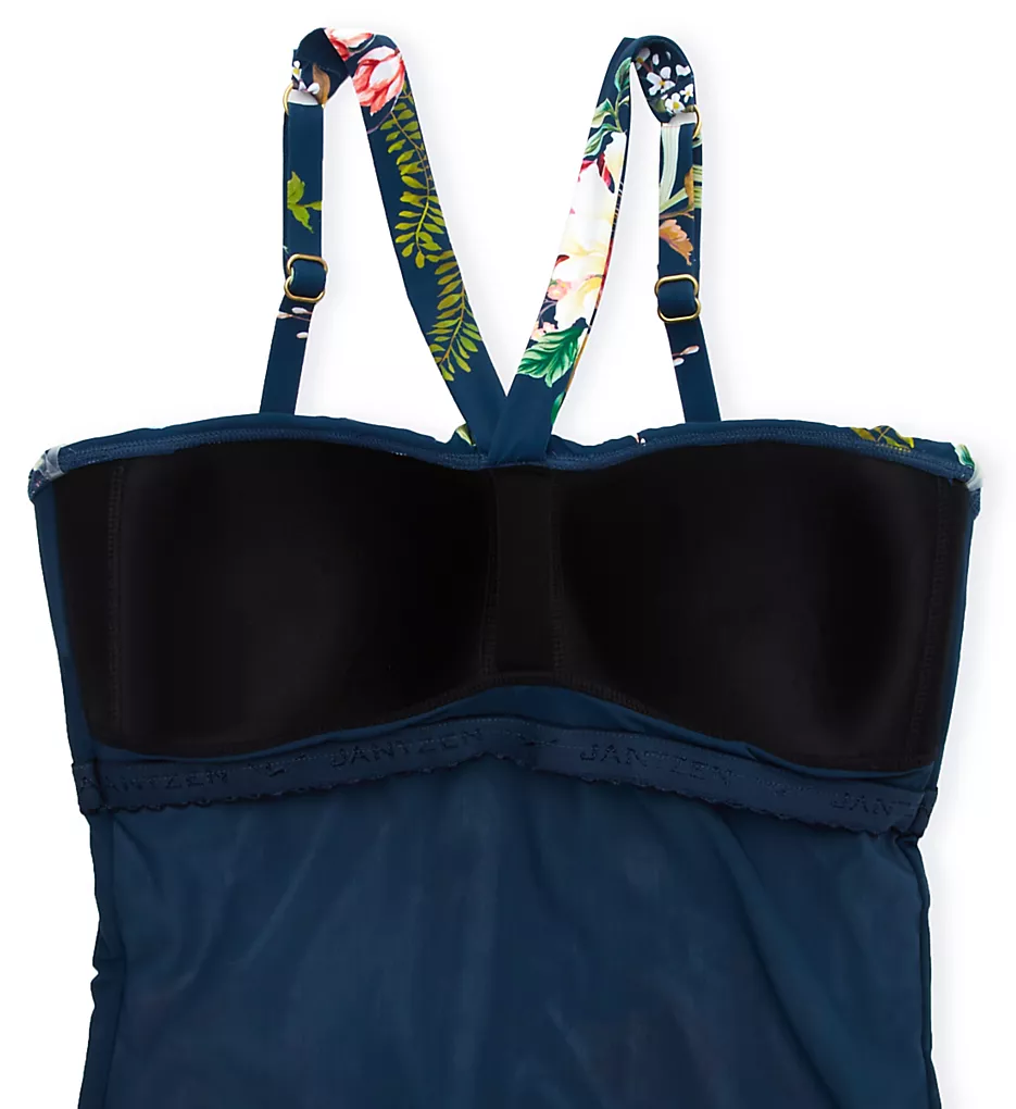 This swimsuit features a sophisticated multi-color floral pattern across a smooth microfiber body. The flounce neckline creates a playful, feminine aesthetic, while the unique two-ply microfiber straps transition into adjustable goldtone hardware for a customized fit. The full rear coverage and seamless back ensure a polished, confident silhouette from every angle.