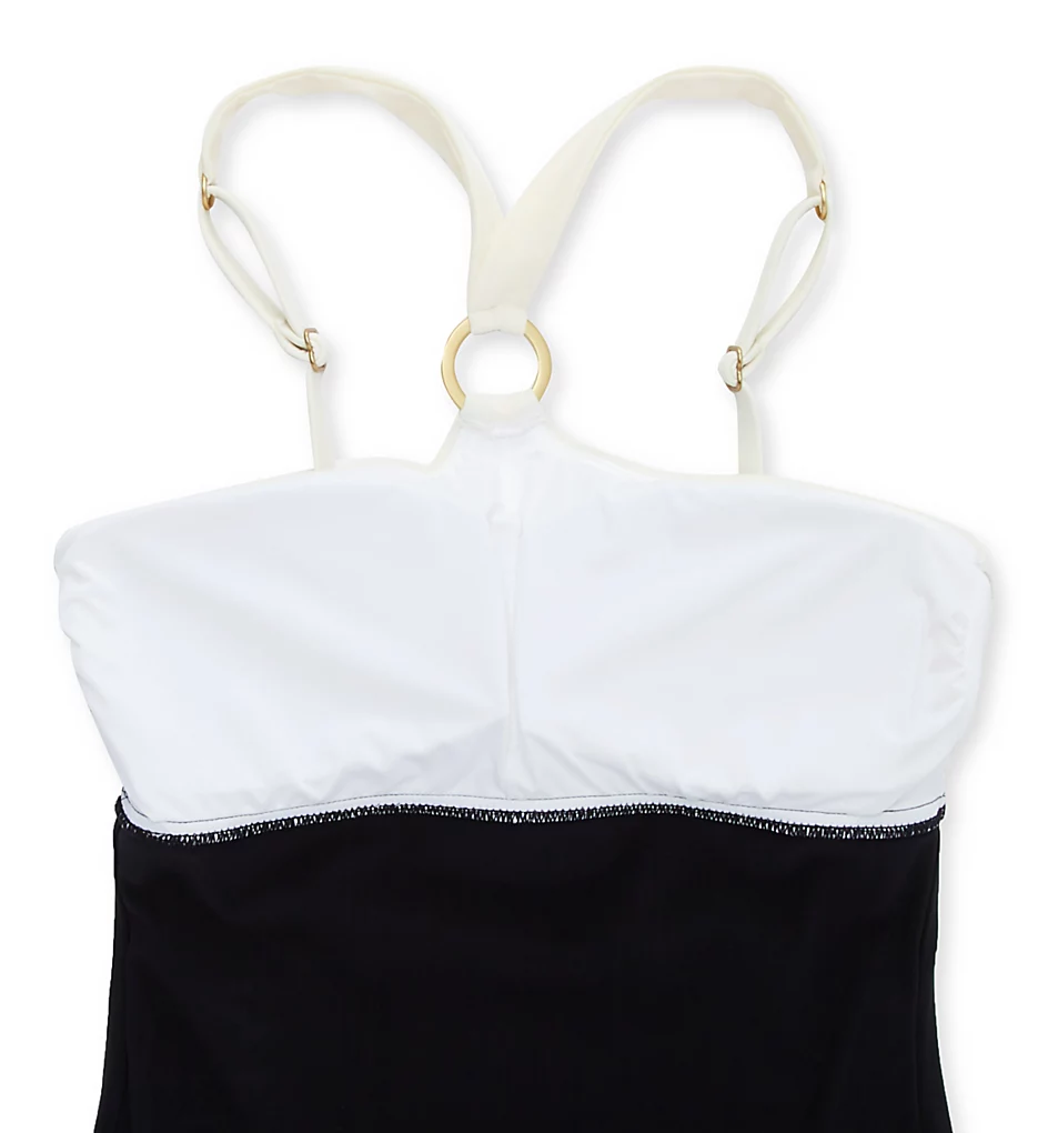 The Lola features a striking color-block design, pairing a buttery cream microfiber top with a sleek, slimming black body. The focal point is a luxe, matte goldtone metal ring at the center neckline that anchors the wide front straps, while side ruching adds a textured, flattering touch to the bust and torso for a feminine silhouette.