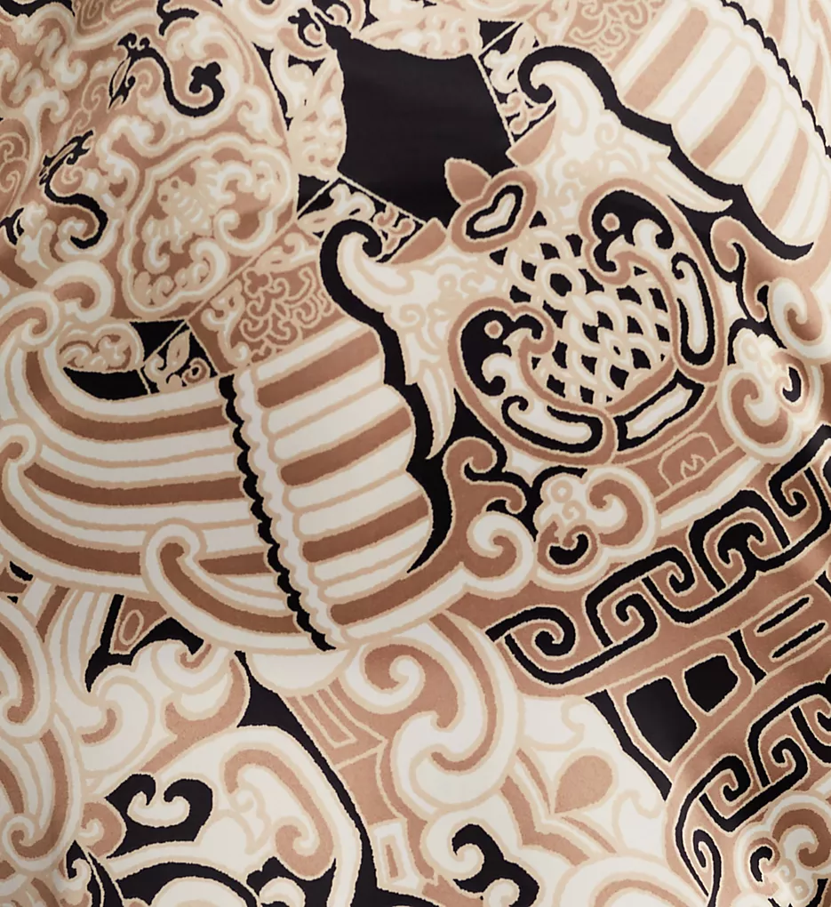 Richly detailed caftan in a sophisticated pattern of earthtones with stretch added to the silk weave for extra comfort. Made of a woven blend of polyester and spandex.