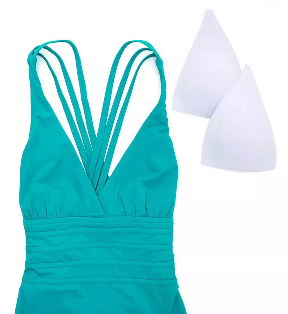 This stunning one-piece features a rich deep teal (petrol) colorway that provides a timeless, luxurious aesthetic. The front is defined by a plunging crossover V-neckline and intricate ruching along the underside of the bust and waist, while the back showcases a sophisticated triple-strap crossover design for a contemporary, secure fit.