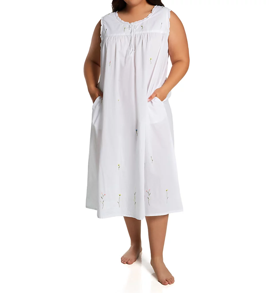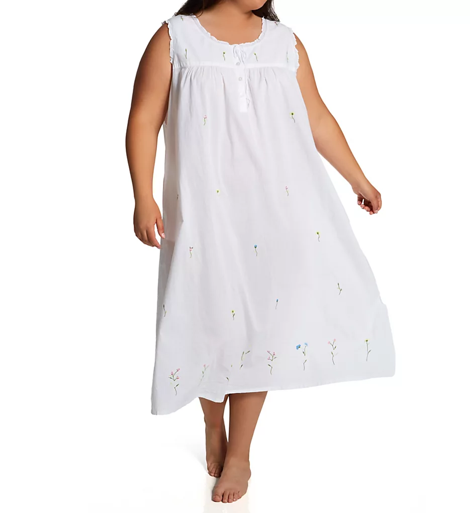Experience the breathable luxury of the La Cera Plus Size Woven Cotton Nightgown. This sleeveless gown combines a classic silhouette with feminine details like delicate floral embroidery and charming ruffle trims.