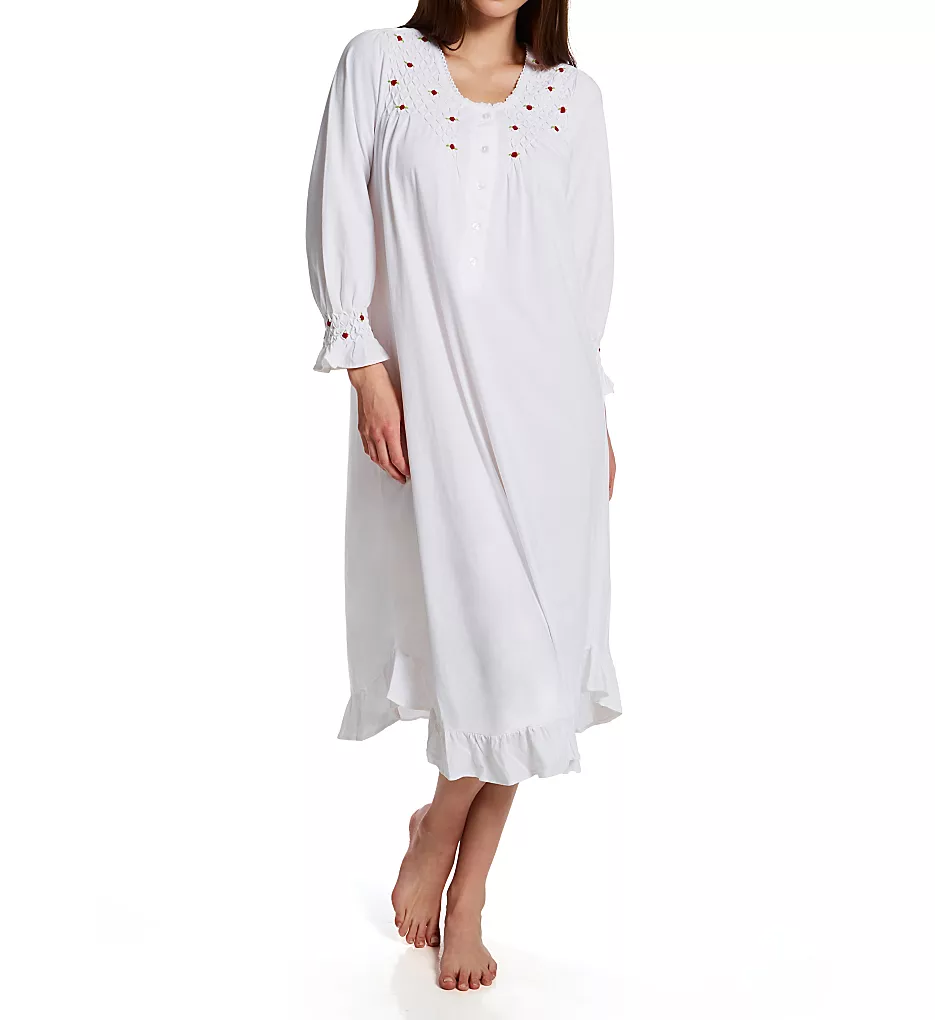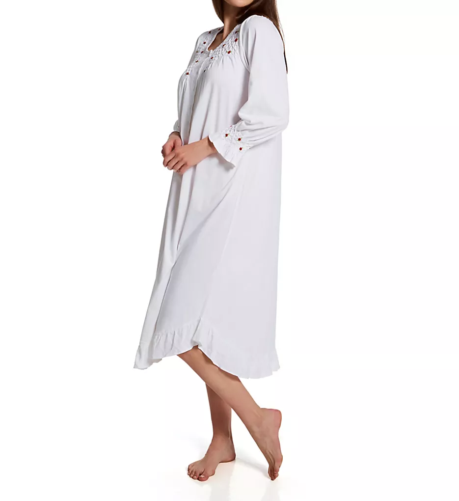 Crafted from crisp white 100% cotton knit, this gown is elevated by intricate smocking at the neckline and sleeve cuffs, adorned with dainty red rose embroidery. The round neckline is finished with a sweet picot lace trim, while a playful ruffle band at the hem adds a touch of classic femininity.
