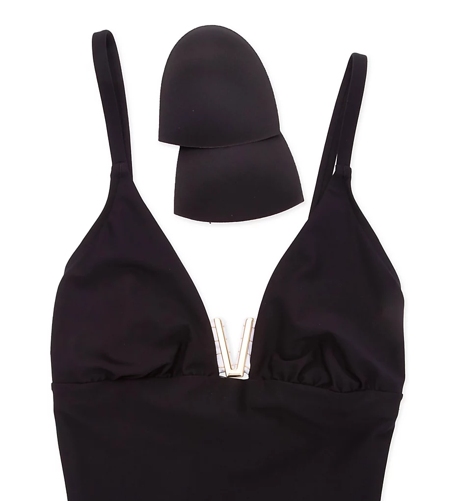 This swimsuit features a rich, deep ocean blue body contrasted by striking white casings at the plunging neckline. The focal point is a statement goldtone metal V-hardware piece, meticulously embellished with golden metallic thread stripes. The ruched cup overlays and sleek microfiber finish create a silhouette that is as flattering as it is fashionable.