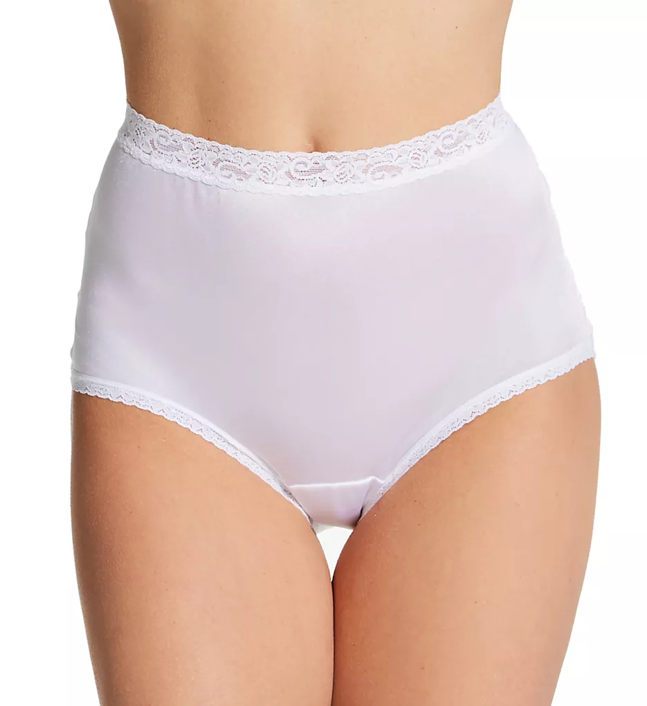 This 3-pack includes high rise brief panties with stretch lace sewn along the edges for a delicate touch. Made of nylon with cotton crotch lining.