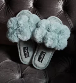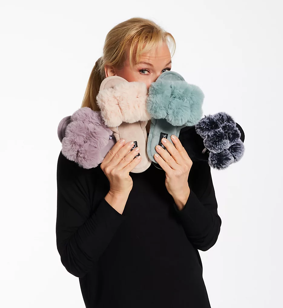 Adorable open toe slippers have faux fur pom-pom accents at top. Made of polyester.