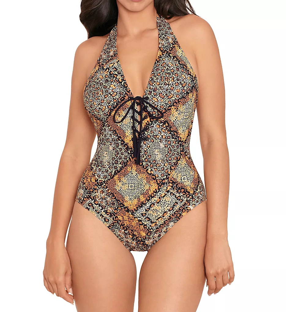 The Mazie Sirena features a deep plunge V-neckline framed by an adjustable lace-up center. Gold-tone grommets house microfiber ties finished with metallic beads and playful tassels, allowing you to customize your coverage level. The exotic leopard pattern is complemented by a low-cut V-back that mirrors the front’s lace-up aesthetic, while the wide halter straps ensure a secure, adjustable fit at the neck.