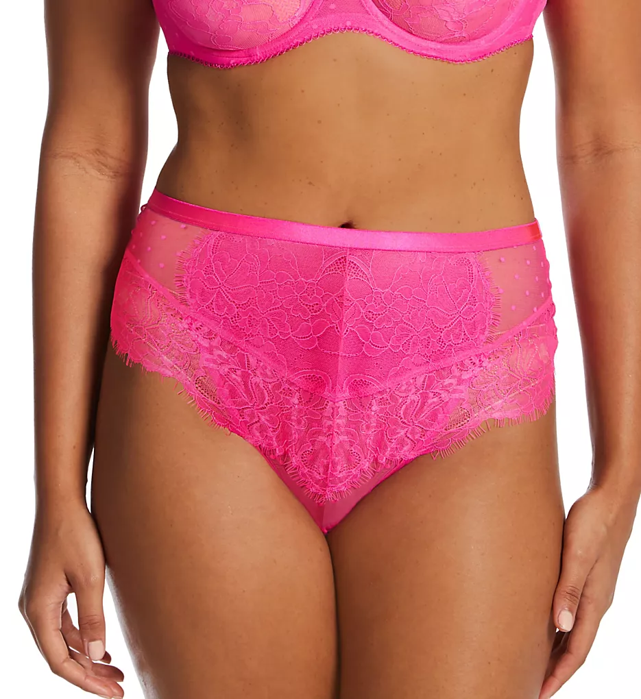 Sheer, high rise thong has polka dot mesh with floral lace at center front and leg openings. Made of nylon and spandex.