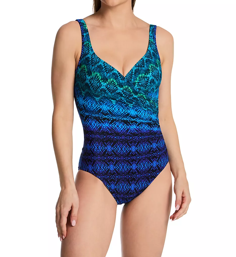 Experience the legendary slimming power of Miraclesuit with the Ocean Ombre It’s A Wrap One Piece. Designed to make you look 10 lbs lighter in 10 seconds®, this swimsuit features a captivating blue and teal geometric pattern that transitions beautifully like the ocean tide. The elegant wrap-around style and strategic ruching create a sophisticated silhouette that highlights your curves while smoothing your midsection.