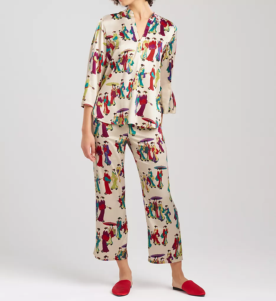 Featuring a highly detailed, colorful print, this set includes a top with a sophisticated banded collar and a deep open neck. The 3/4 sleeves are thoughtfully finished with split ends for ease of movement, while the matching bottoms offer a chic, cropped ankle length. The lightweight woven satin allows for maximum air circulation, making it the perfect choice for warm nights.