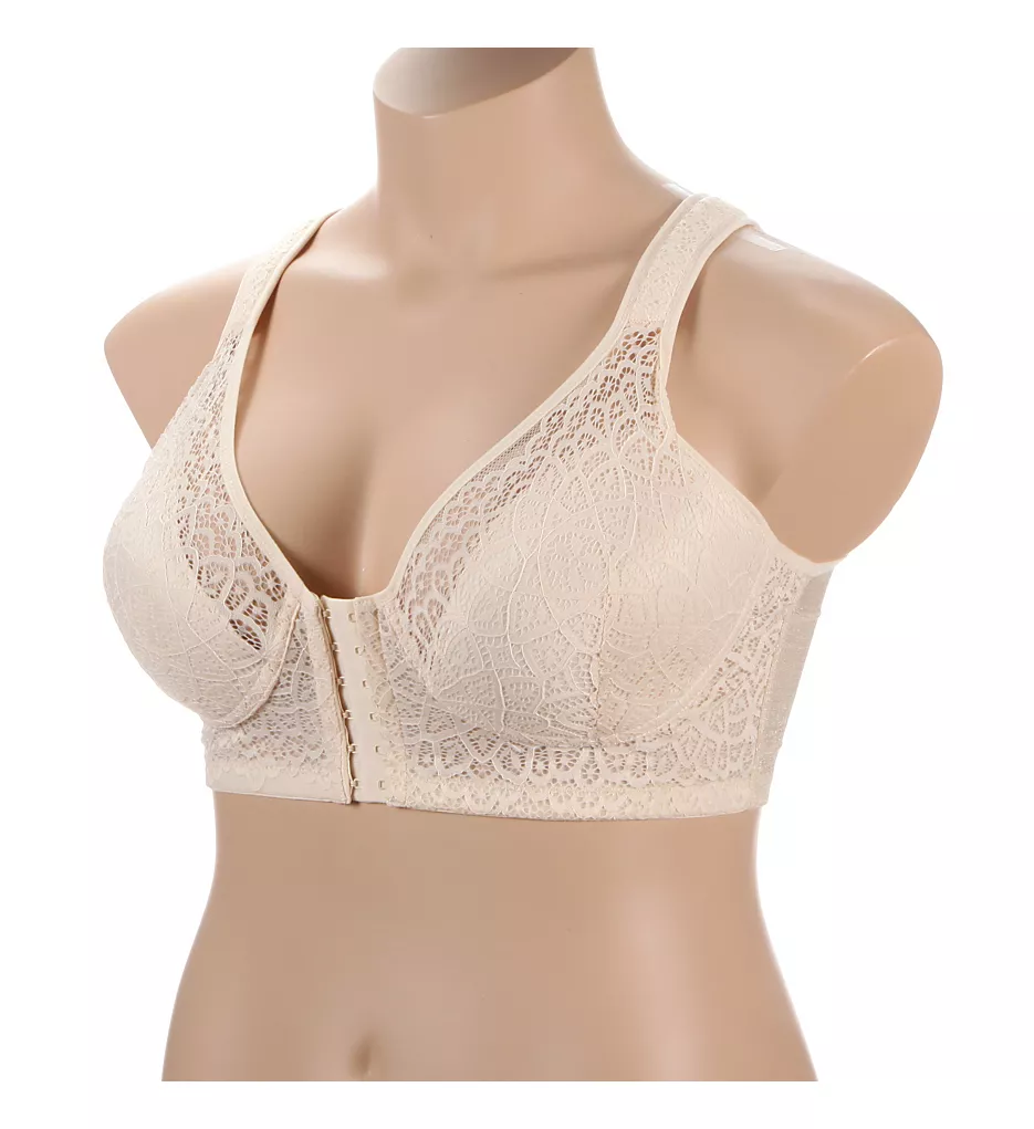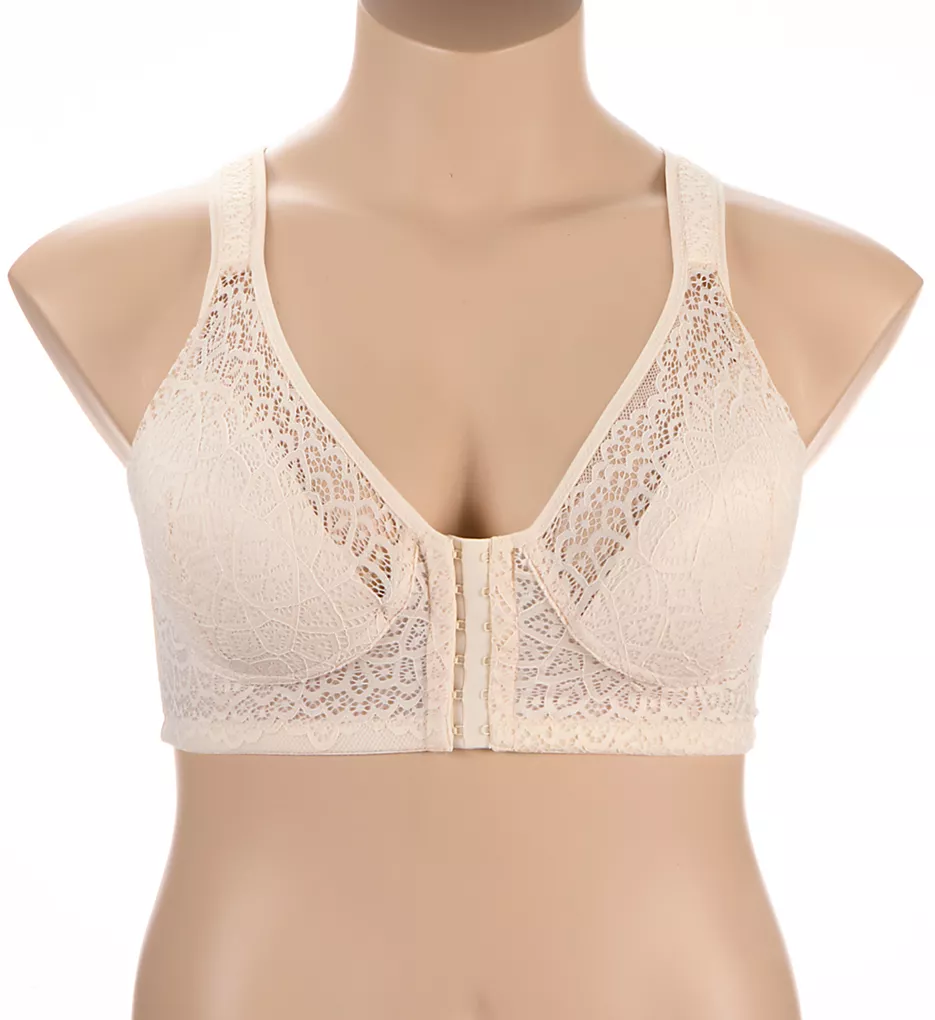 - Wide, tall center front has lace overlay and coated metal hook-and-eye hardware for easy on/off wear. See Fitter’s Comments below for hook count.