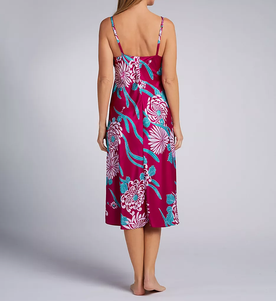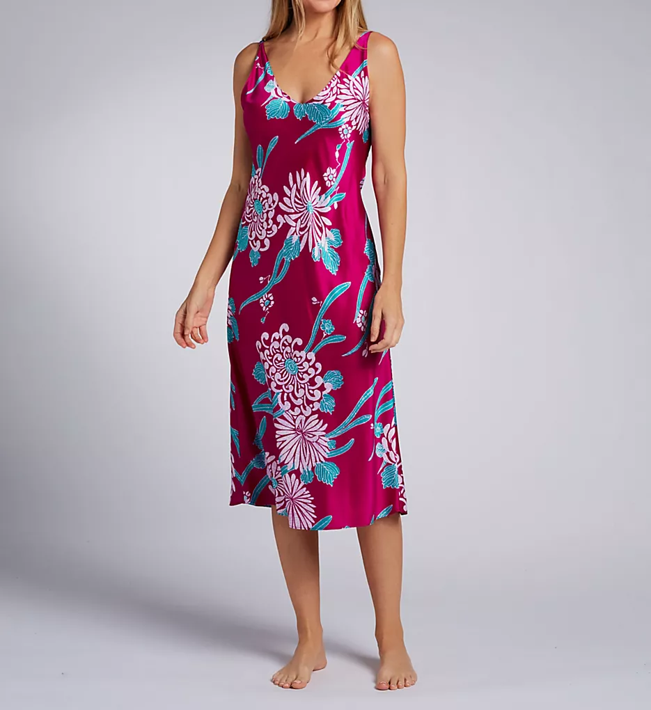 Elegant nightgown with a luxurious feel and a stunning chrysanthemum pattern. Made of a satin-woven blend of polyester and spandex.