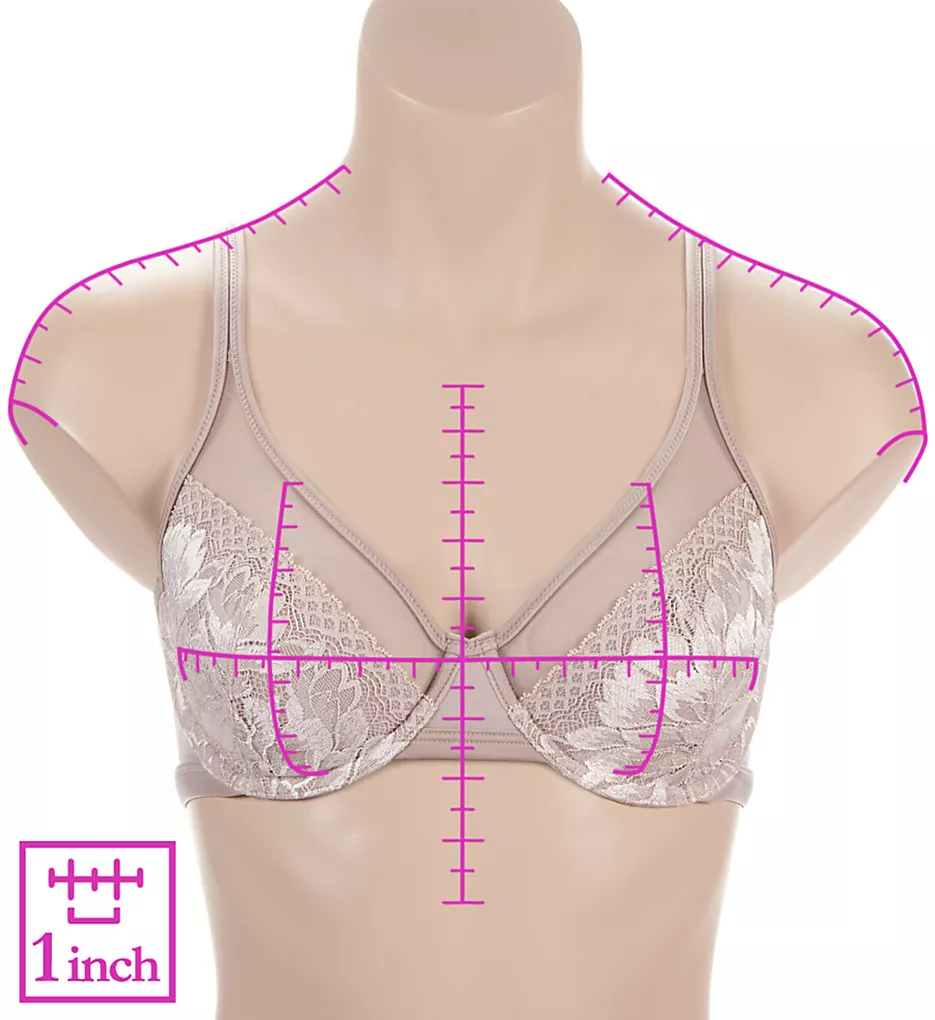 Sheer floral lace and mesh combine to create this charming underwire bra. Minimizer cups help reduce bust by 1.5″. Made of nylon and spandex.