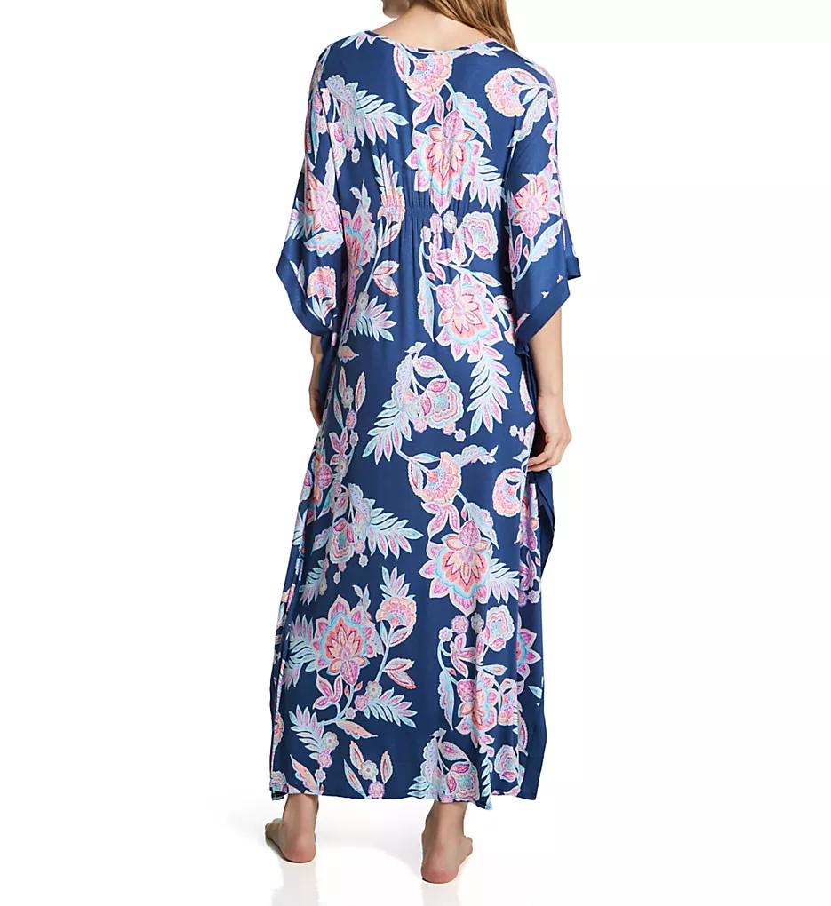 Flowing caftan has striking paisley print on a soft knit that’s rayon and spandex.