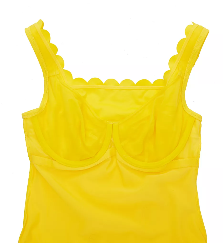This piece is defined by its luxe honeycomb-textured fabric in a brilliant ‘Sunshine’ yellow. The sophisticated square neckline features a unique laser-cut scalloped border, providing a delicate feminine detail to the sleek silhouette. Beneath the surface, a full built-in shelf bra with underwire and mesh-lined cups offers genuine bra-sized support, while the internal powernet front panel provides effortless tummy control.