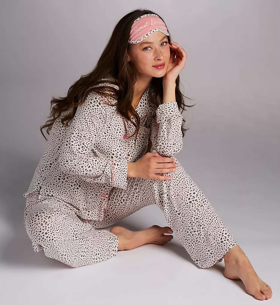 This set features a modern grey and white animal motif, beautifully contrasted by signature pink piping along the notched collar, button placket, cuffs, and leg sides. The coordinating sleep mask is elegantly embroidered with “Sweet Dreams” in pink script, adding a touch of luxury to your rest.