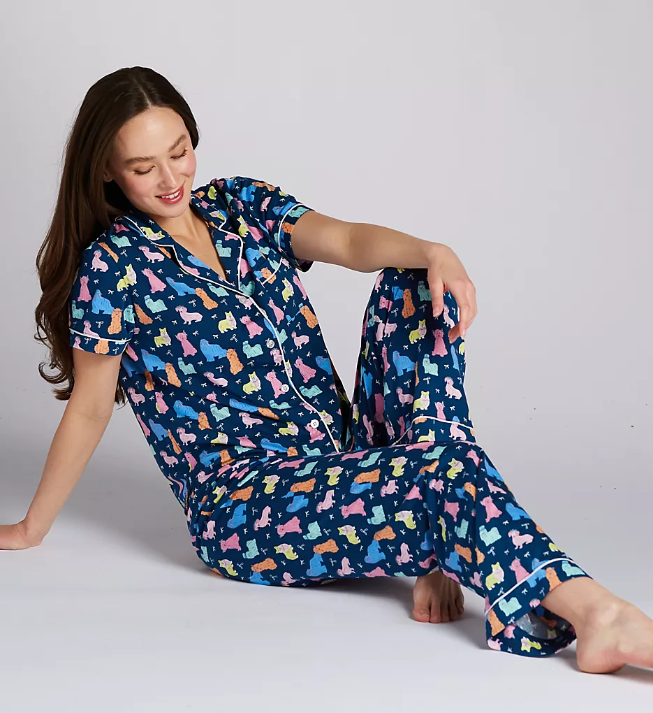 The set showcases a multi-colored canine motif on a serene pastel background. The top features a timeless notch collar and a functional chest pocket, while the full-length bottoms provide a relaxed, straight-leg fit. Every detail, from the ivory drawstring to the delicate piping, is crafted to enhance your sleepwear experience.