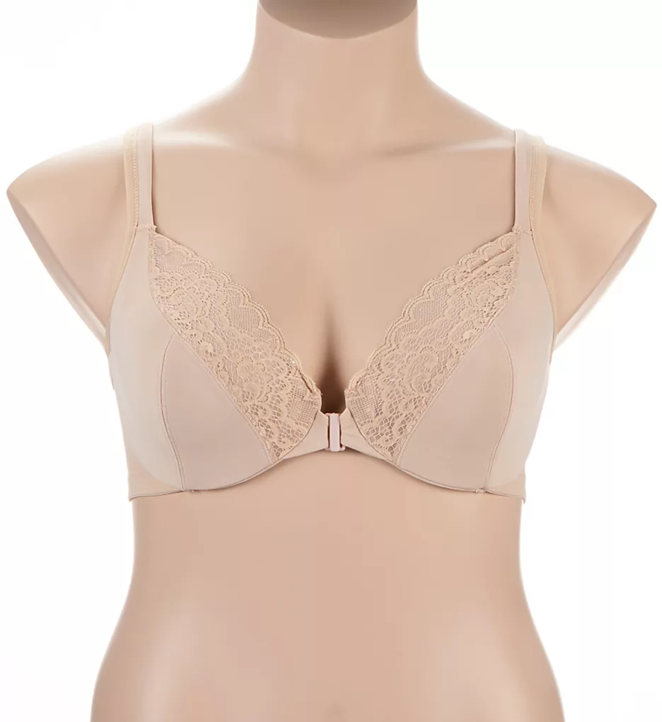 This front close bra fits like a dream and offers supreme support with seamed underwire cups. Padded front straps help keep straps from falling off your shoulders. Made of nylon and spandex.