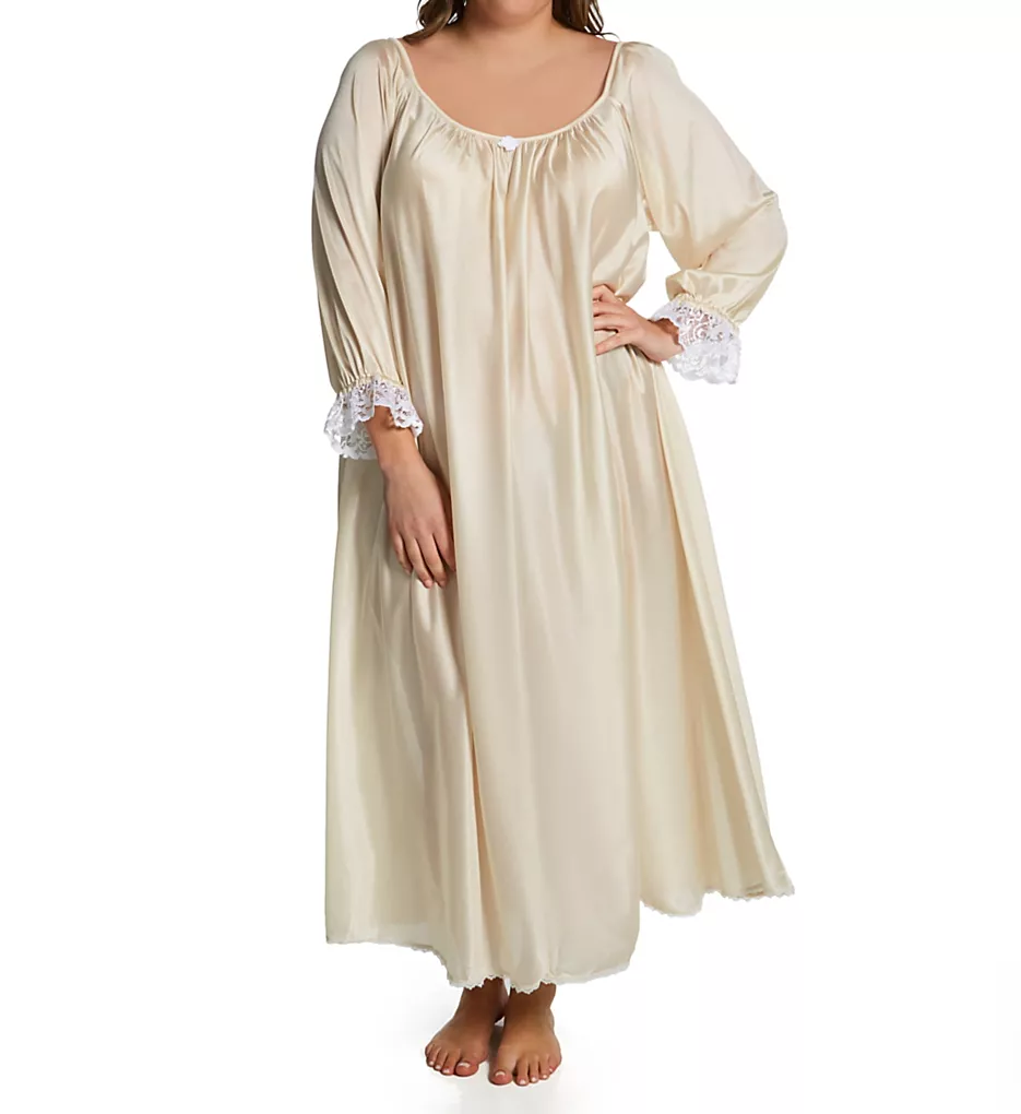 This graceful long gown gives a generous fit and has elegant lace details at cuffs and hem. Glossy, woven fabric is made of 100% nylon.