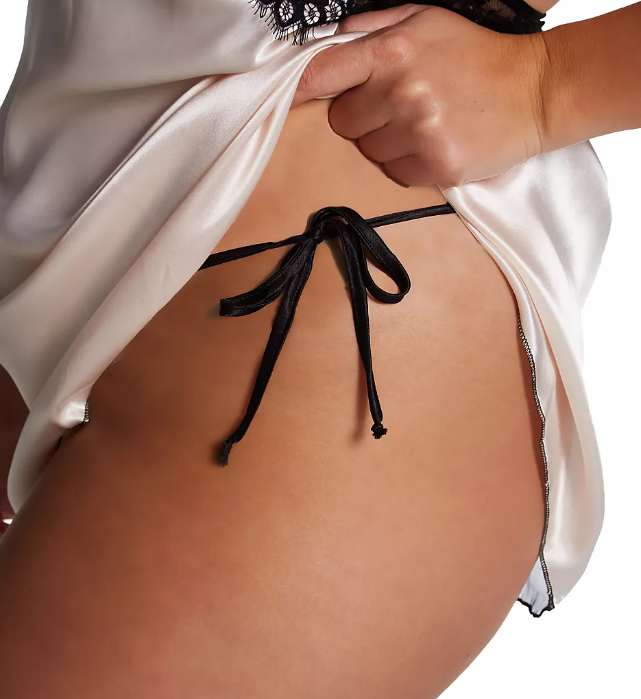 - Coral/Black thong does not tie at the side. It has a covered elastic waistband. This thong is also lined.