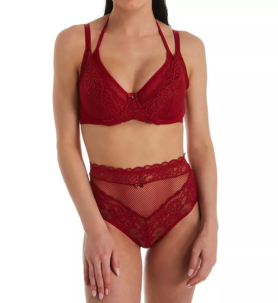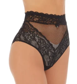 - Front contrasts elegant floral lace with a triangular fishnet inset for a stunning look.